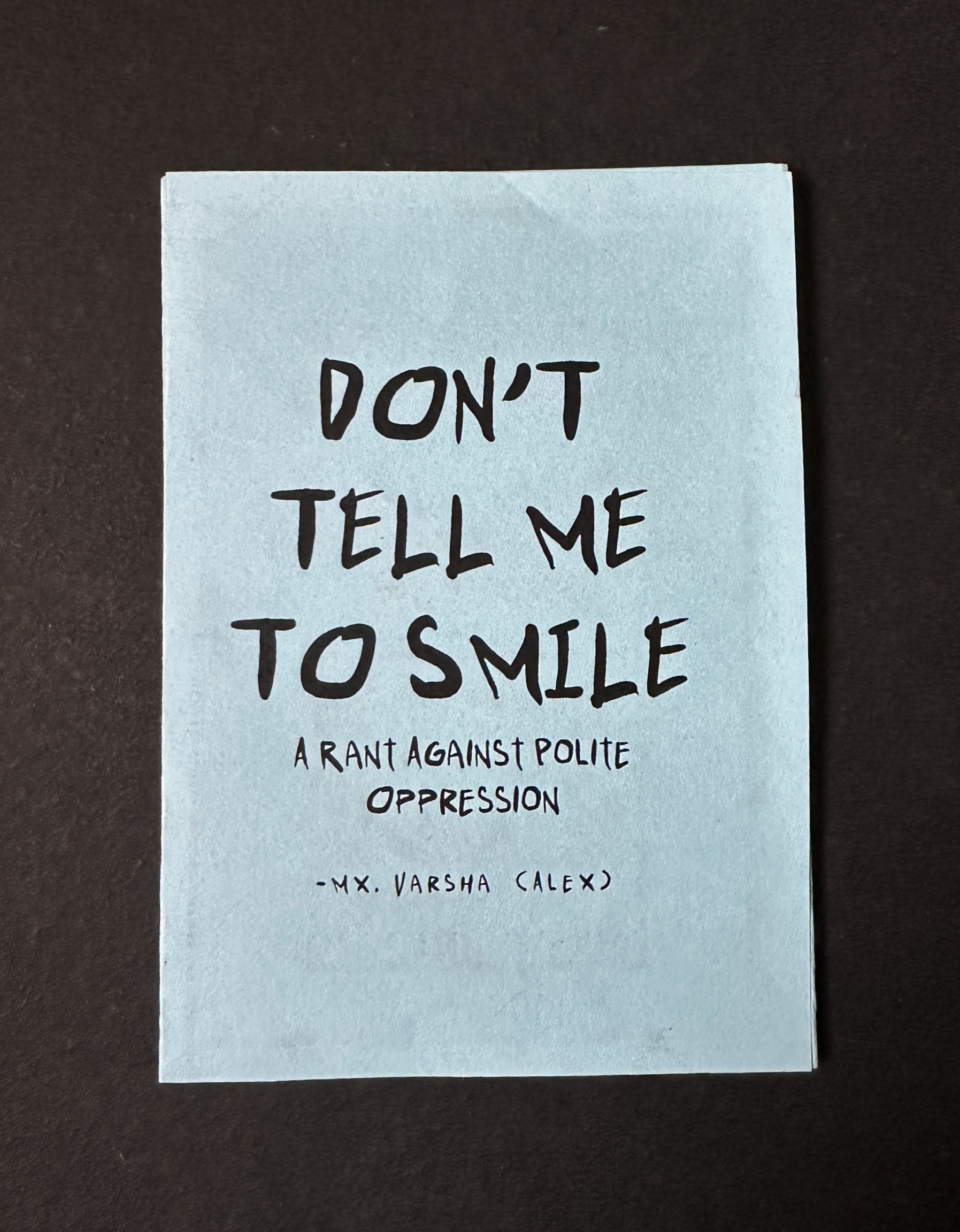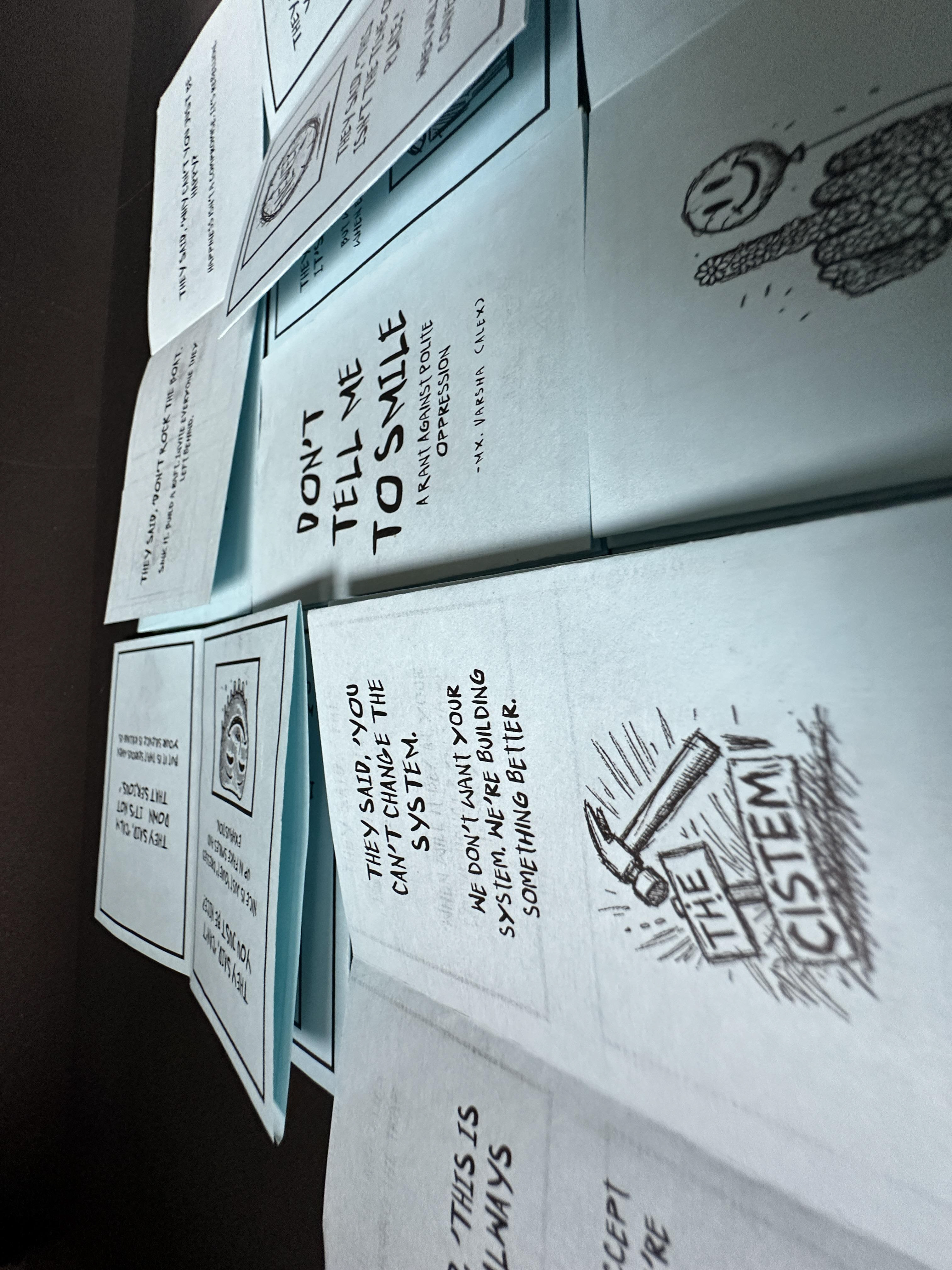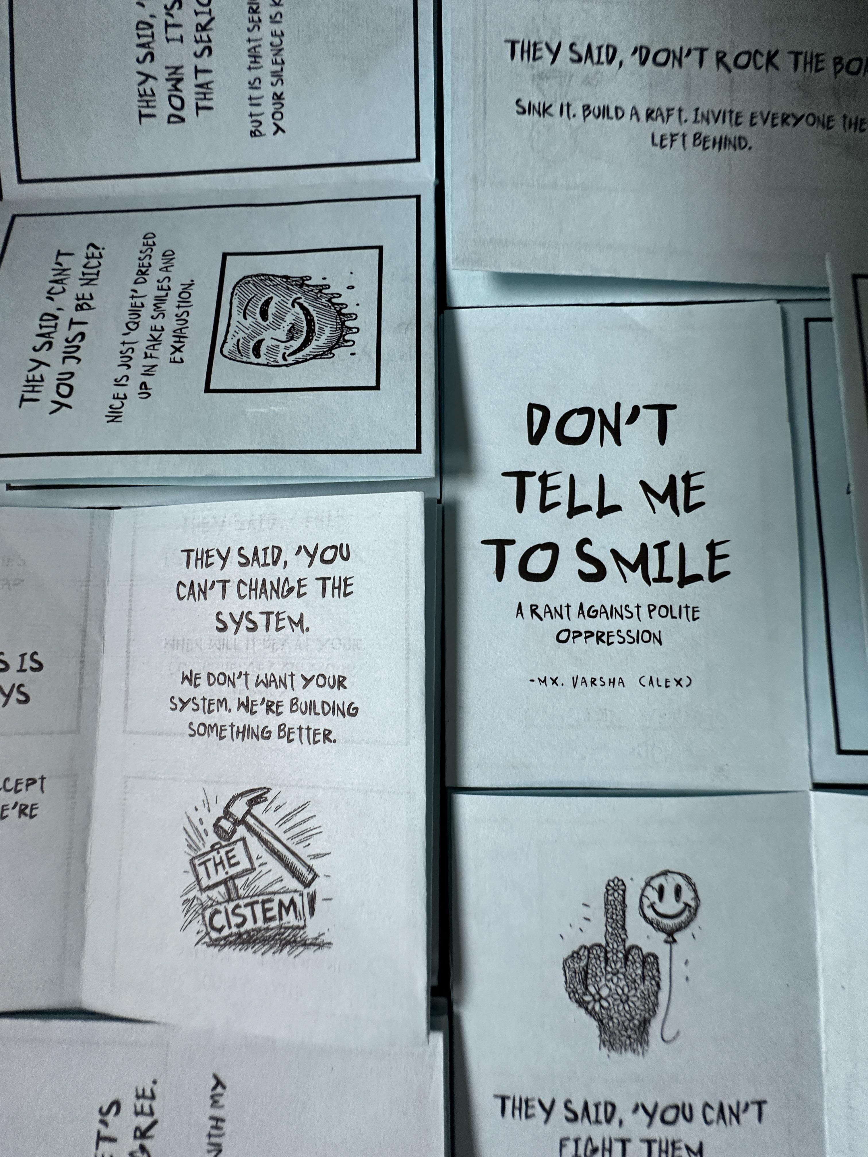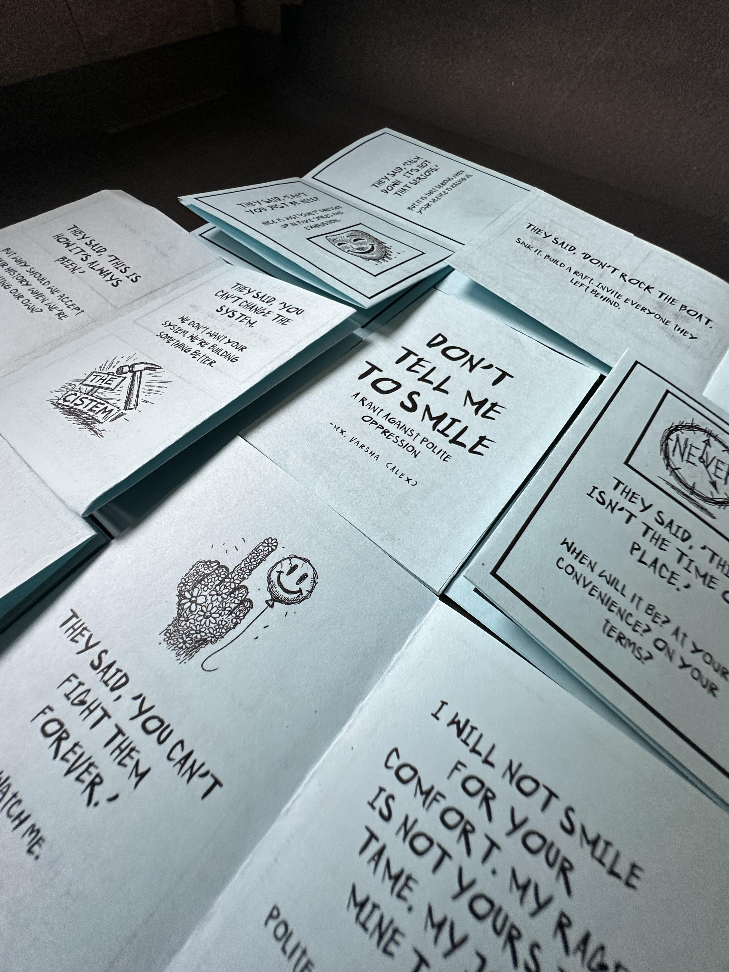 'Don’t Tell Me to Smile' is a mini zine that challenges societal expectations and reclaims space for authenticity. Written and illustrated by Varsha Panikar, it’s a manifesto for defiance and self-expression. Author: Varsha Panikar Publisher: Riot Ink Press Format: Mini Zine