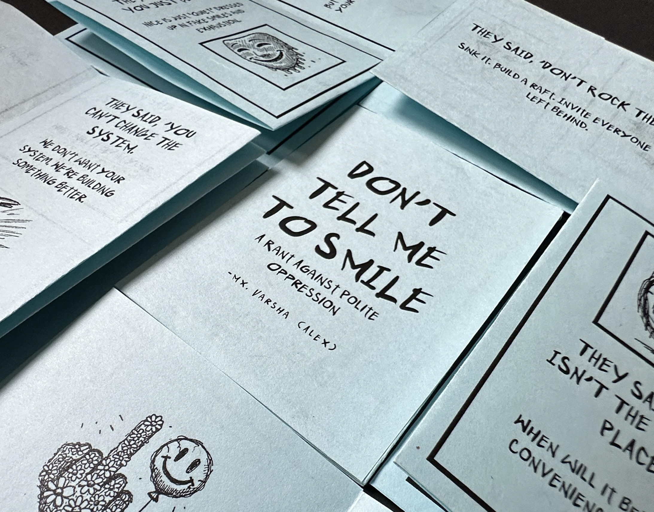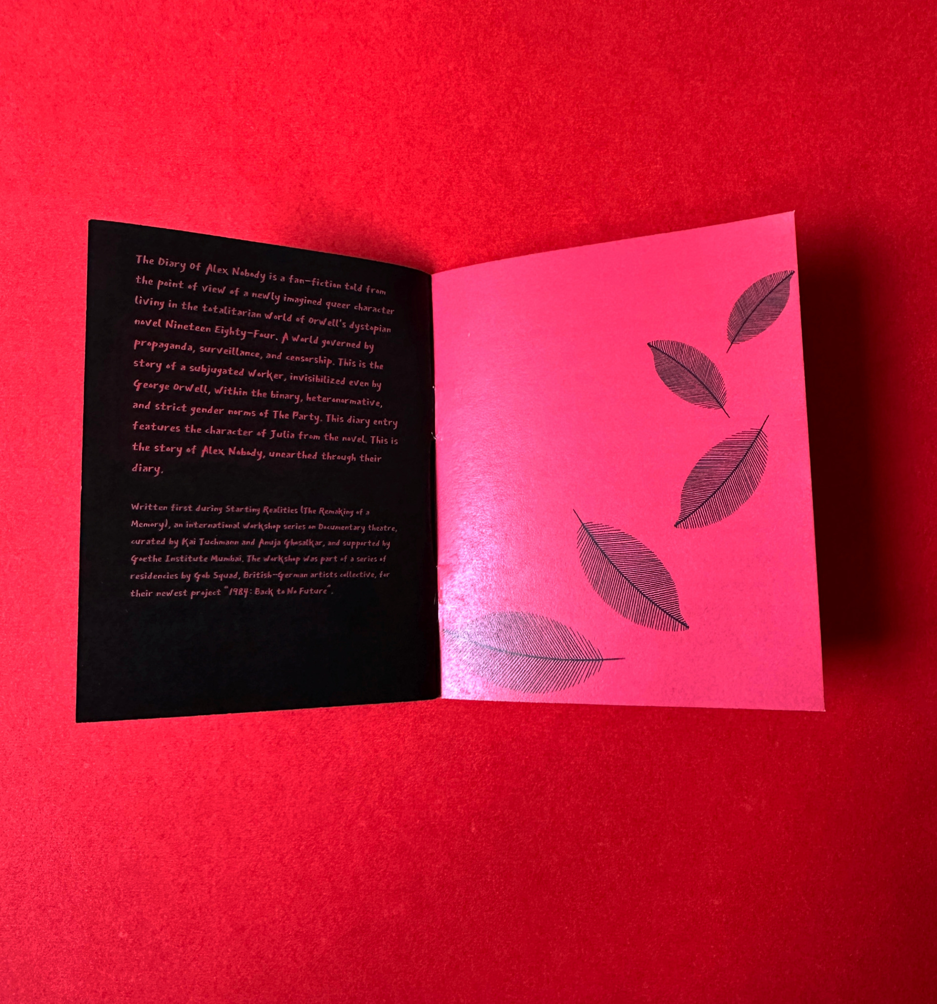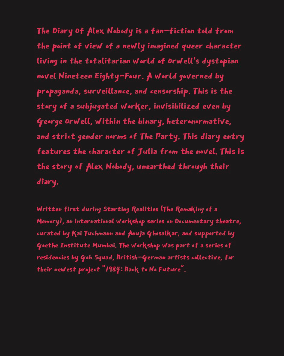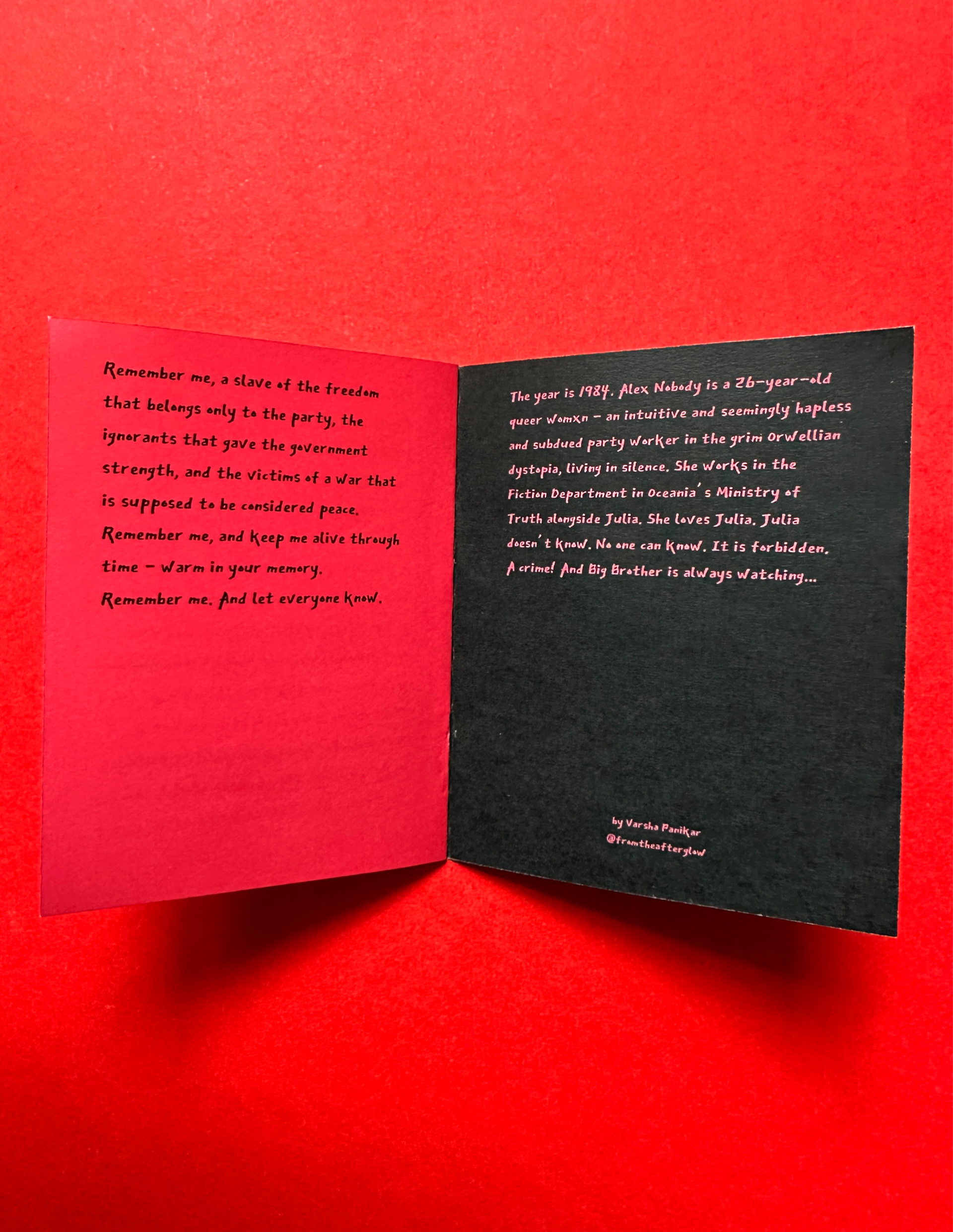 'The Diary of Alex Nobody' is a fan-fiction zine set in Orwell's Nineteen Eighty-Four, reimagined through the fragmented and nonlinear diary entries of Alex, a 26-year-old queer character. Each release offers a piece of Alex's story, unraveling love, oppression, and resistance under Big Brother's gaze. Readers can collect and piece together the entries to uncover the full narrative, a daring act of defiance in itself. Author & Illustrator: Varsha Panikar Publisher: Riot Ink Press Format: Mini Zine