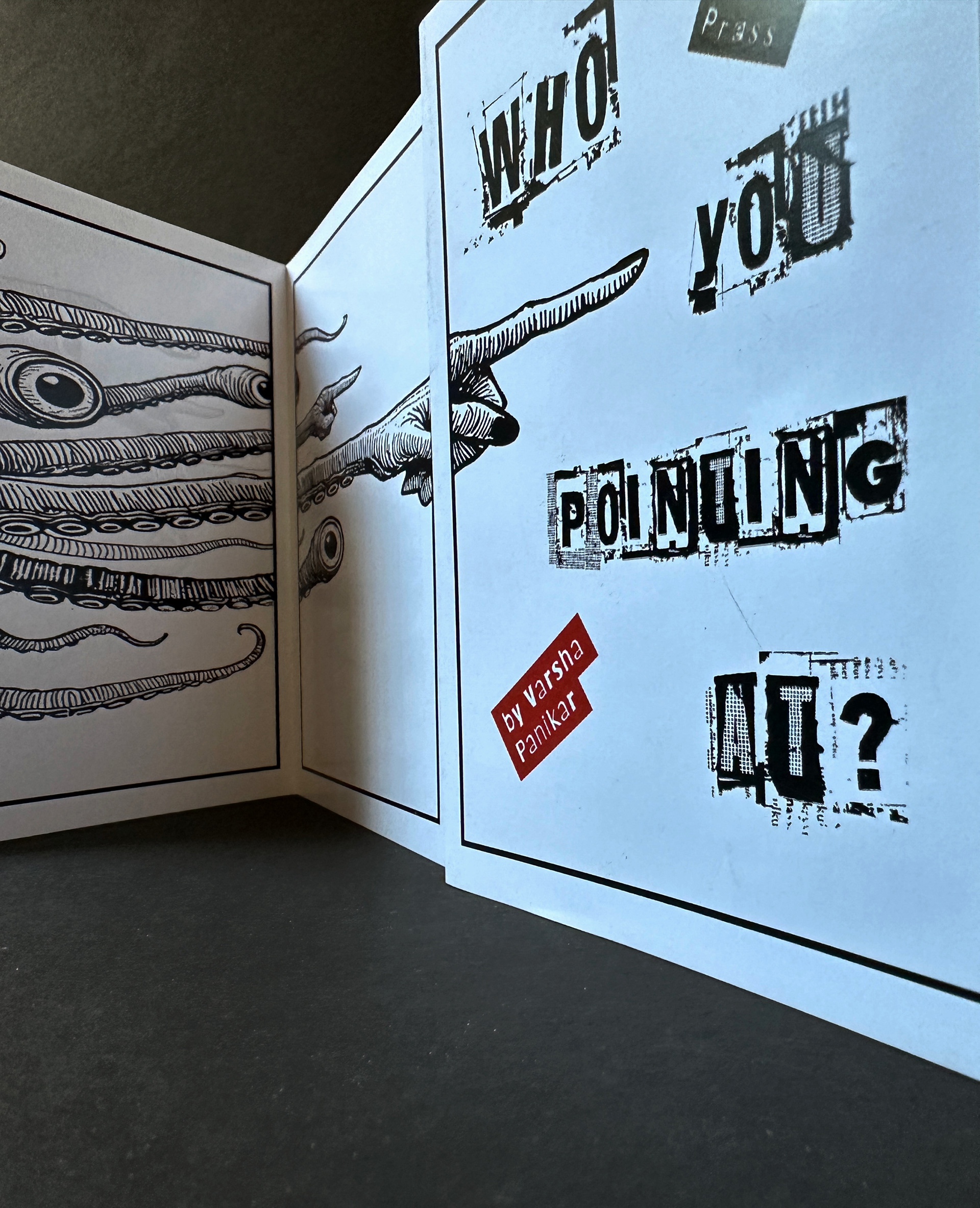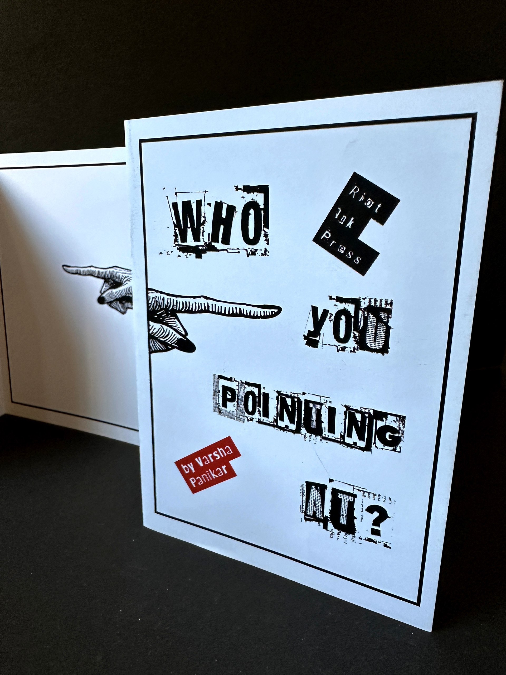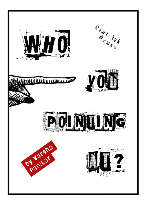 'Who You Pointing At?' is visual exploration of perception, judgment, and self-awareness, challenging the act of pointing fingers and the narratives we build around identity and accountability. Illustrator: Varsha Panikar Publisher: Riot Ink Press Format: Zine